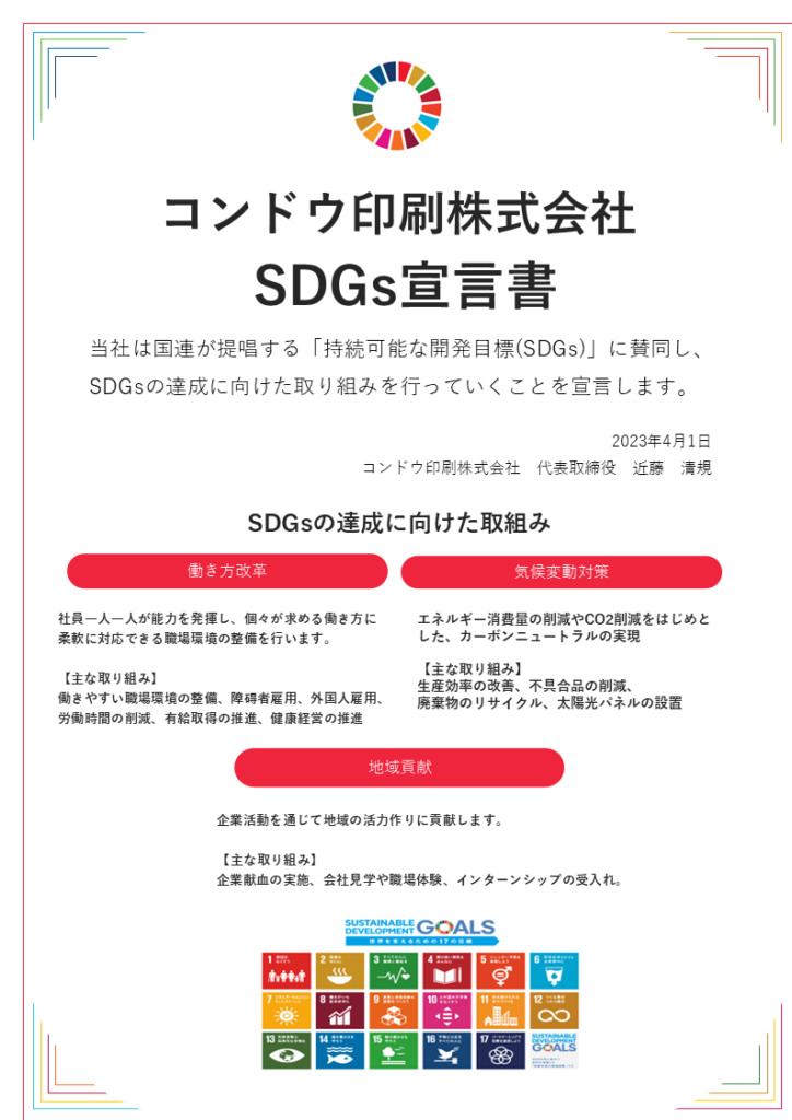 コンドウ印刷は、「人の役に立つことを一番の喜びとし、お客様・社員・地域社会から必要とされ続ける企業であり続けるために企業活動を行います」を経営理念に掲げ、持続可能な社会の実現に向け企業活動を行っています。